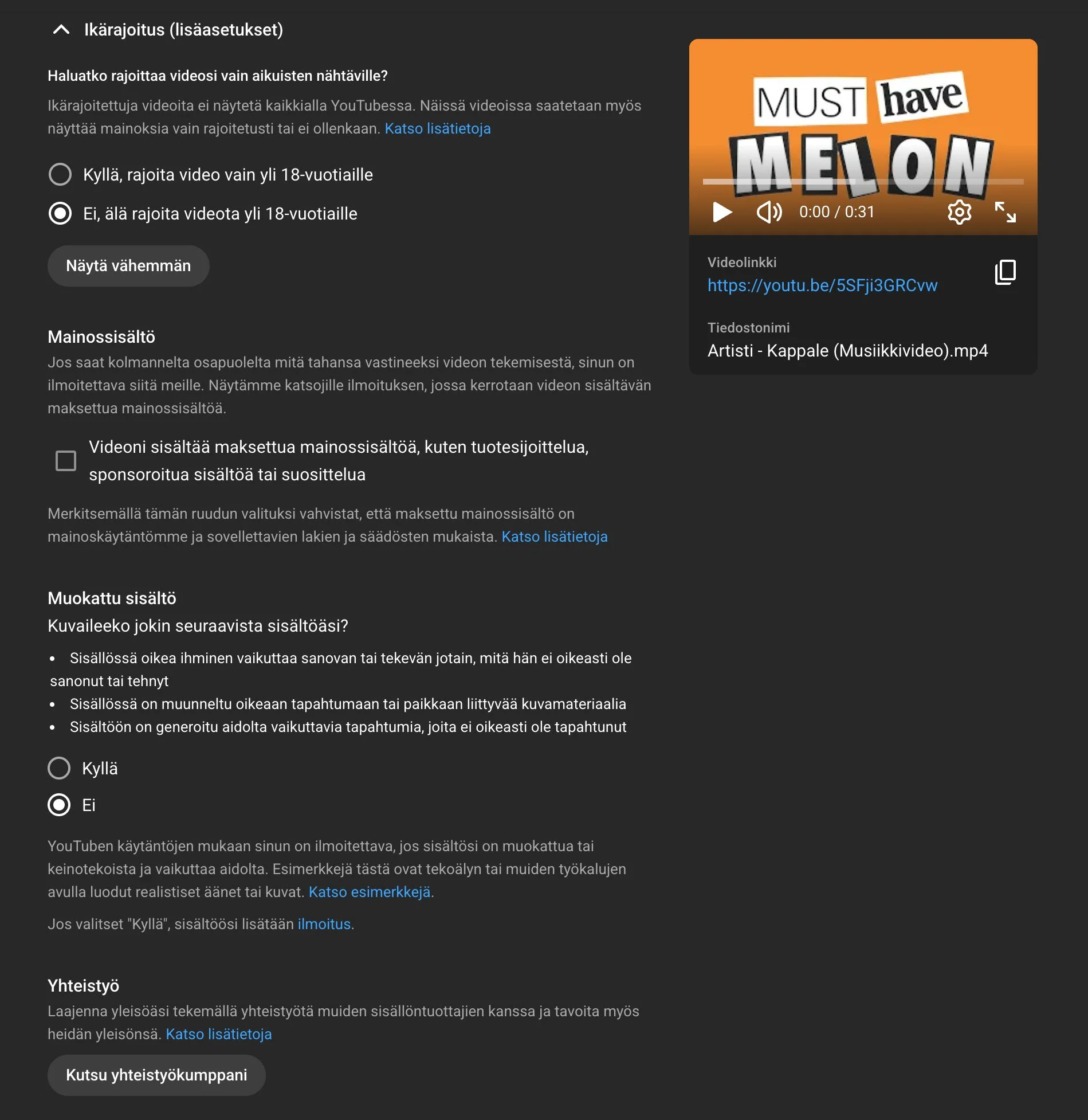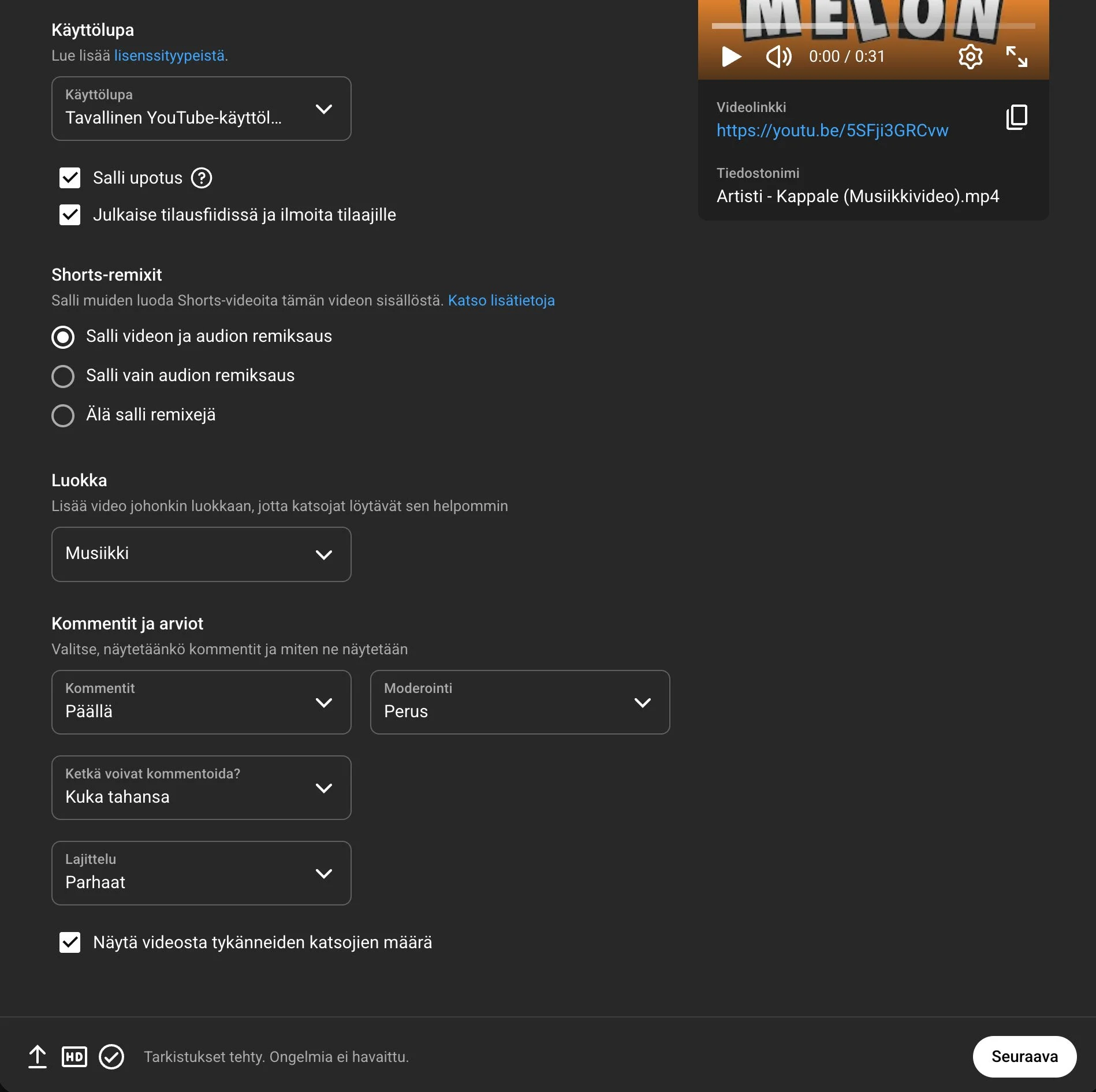 Tarkista, että videon luokka on oikein “esim. Musiikki” ja että kommentointi on päällä.