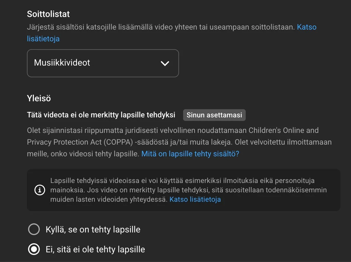 Jos video on merkitty lapsille tehdyksi, sitä ei voi esim. kommentoida.