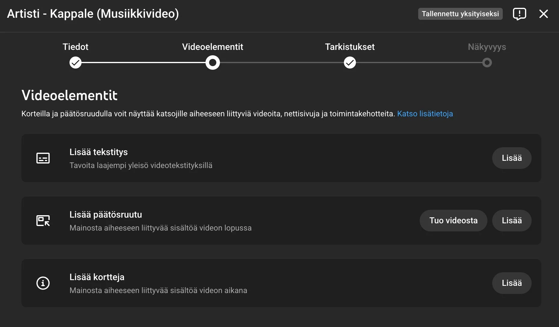 Aseta video Yksityiseksi ennen julkaisua. Jos mahdollista, lataa video 24-48 tuntia ennen julkaisua tubeen, jotta tekoälyalgoritmi ehtii analysoida videon (vaikuttaa siihen, miten YouTube suosittelee videotasi).