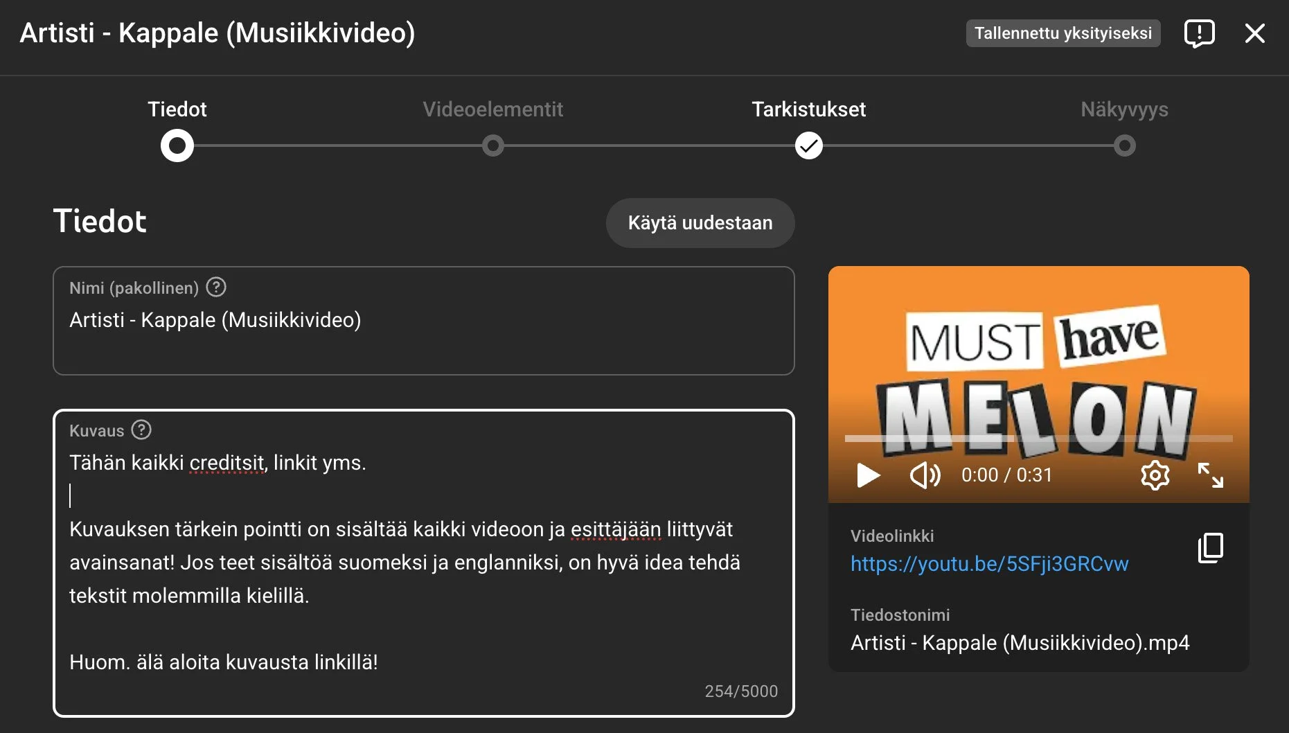 Täytä videon nimi ja description: